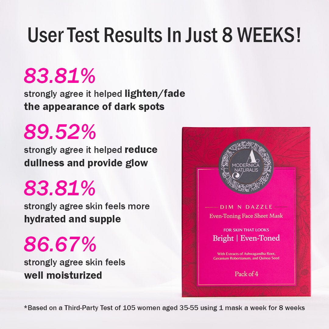 In a third-party study conducted with 105 women between the ages of 35 and 55 who used Dim N Dazzle Sheet Mask once a week for 8 weeks, the following results were observed: