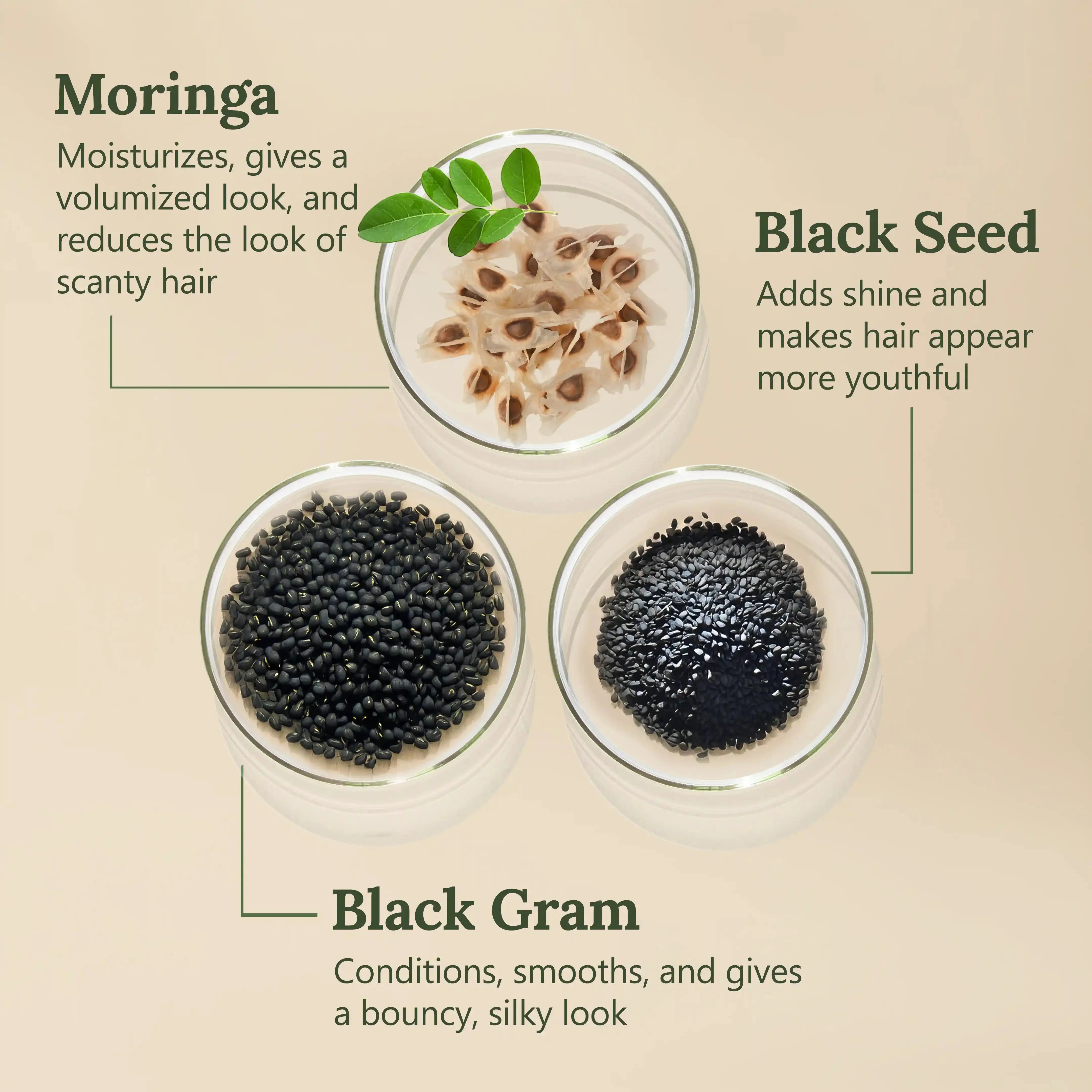 • A revolutionary formula–Ayurveda’s MIRACLE MORINGA, with the most unique blend of hair health-boosting Ayurvedic BLACK GOLD—Black Gram and Black Seed—in a hair mask for the FIRST TIME EVER, which visibly soften and unfrizz the look of dry, dull, and damaged hair